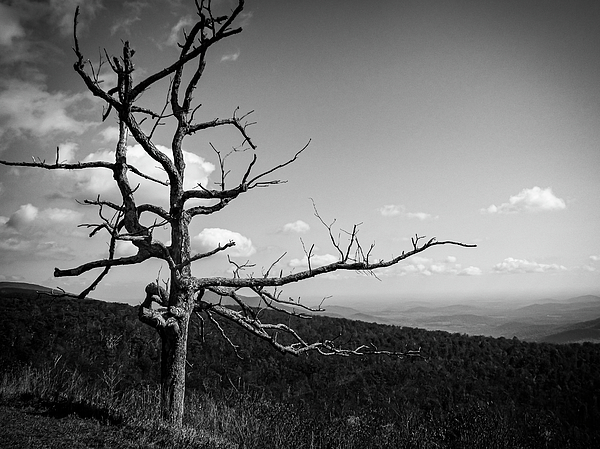 Lonely old bare tree in the mountains of Virginia in black and white.