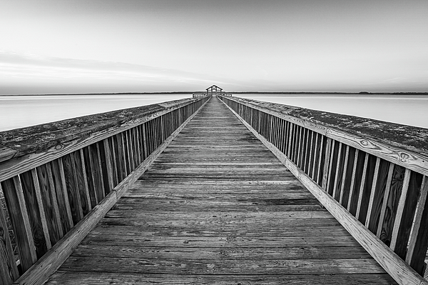 Black and white vanishing point perspective old fishing pier with man at very end contemplating life.